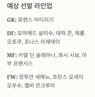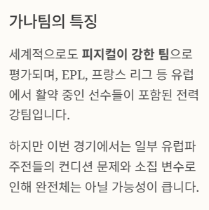 ※ 가나 팀은 유럽 리그에서 활약하는 선수들을 중심으로 라인업을 구성했으며, 최근 핵심 선수 일부가 빠진 상태인 만큼 흐름이 다소 바뀔 수 있습니다.