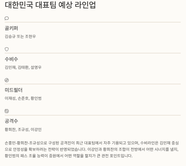 - 대한민국은 공격진의 스피드와 개인 역량에서 우위가 있을 것으로 보이며, 특히 손흥민이나 황희찬이 공간 침투시 기회가 나올 가능성이 높습니다.
