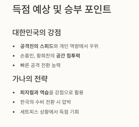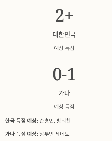 - 득점 예상: 대한민국 2골 이상 가능 → 가나 1골 이내 가능성 높음.