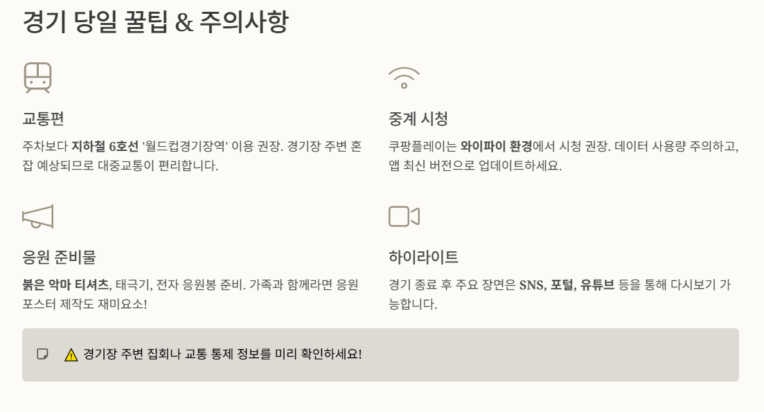 - 주차보다 지하철: 경기장 혼잡 예상 → 지하철 6호선 ‘월드컵경기장역’ 이용 권장