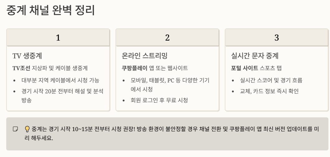 📌 중계는 경기 시작 10~15분 전부터 입장 권장, 방송 환경이 불안정할 경우