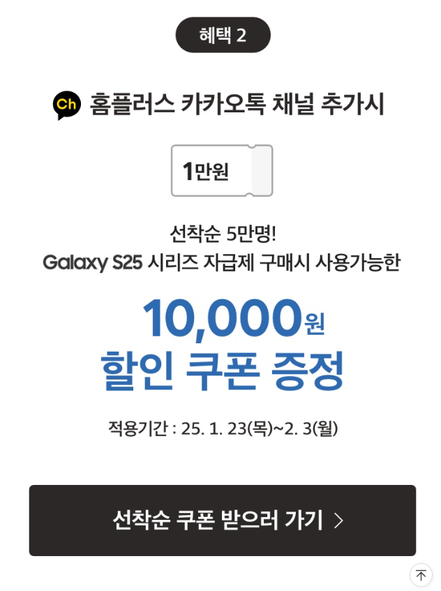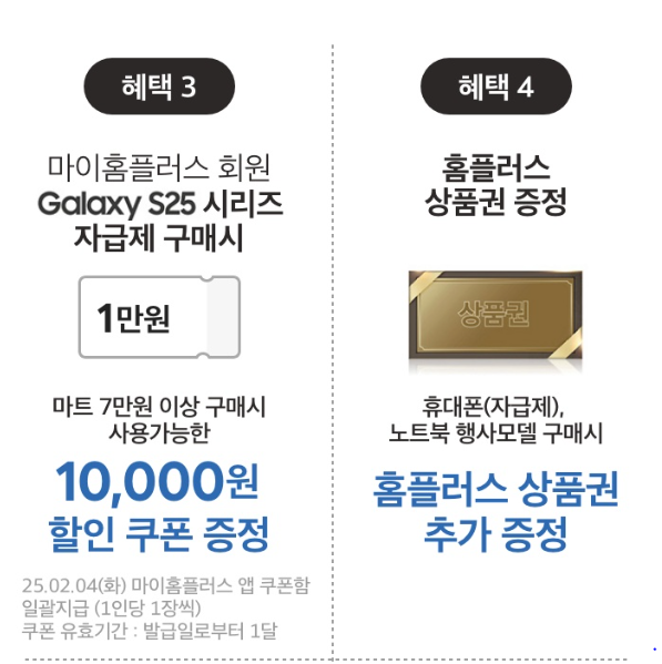 - 마이홈플러스 회원 Galaxy S25 시리즈 자급제 구매시 마트이용권 10,000원 지급