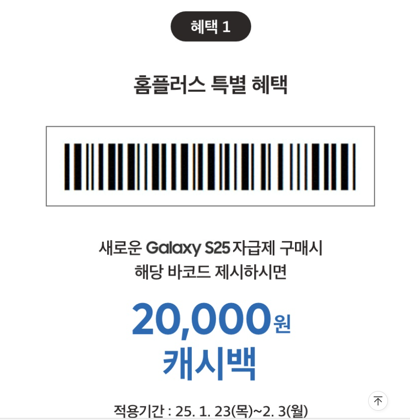 - 자급제 구매시 20,000원 캐쉬백('25.1.23. ~ 2.3.)