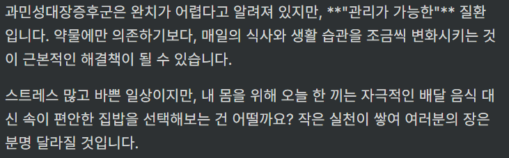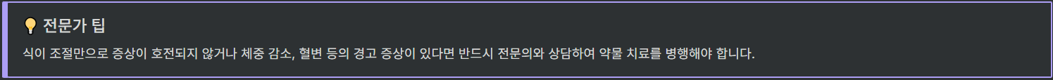 - 식이 조절만으로 증상이 나아지지 않으면, 필요에 따라 병원 진료 및 약물 치료를 고려해야 합니다.