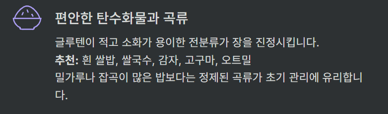 | ✅ 소화에 좋은 단백질 & 탄수화물 중심 | 두부, 계란, 생선, 쌀, 감자, 고구마 위주 식단 |