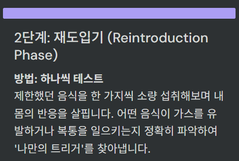– 하나씩 음식을 천천히 소량씩 다시 도입하며 증상 여부 확인