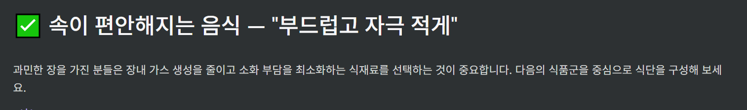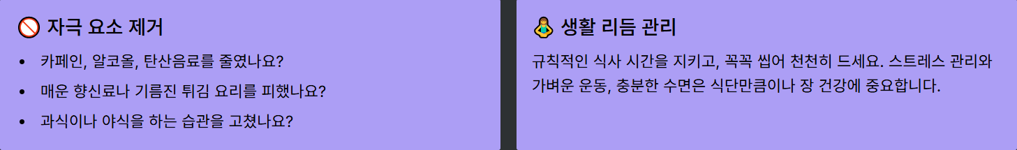 | ✅ 자극 음식 피하기 | 매운 음식, 기름진 음식, 카페인, 알코올, 향신료 제한 |