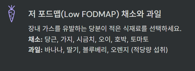 | ✅ 저 FODMAP 식단 시도 | 2~6주간 고 FODMAP 음식 제한 — 증상 반응 관찰 |