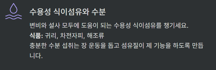 | ✅ 수용성 식이섬유 + 수분 섭취 | 오트밀, 바나나, 물 충분히, 부피형 완하제 활용 |