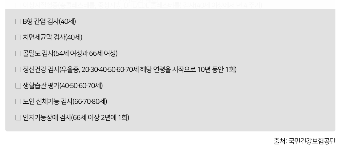 - 건강검진 : 정기적인 건강검진을 통해 조기 발견 및 예방이 가능해요. 특히, 암 검진은 조기 발견에 매우 중요해요.