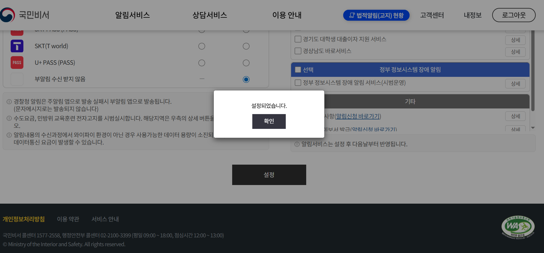 - 서비스 신청 완료 후 선택한 알림 앱에서 수신 동의 팝업 확인