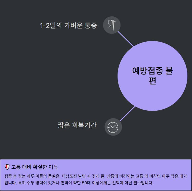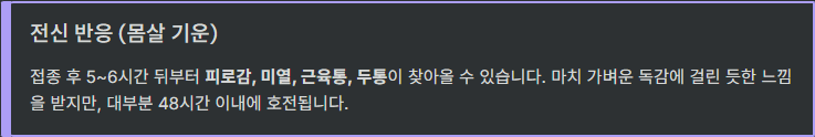 👉 즉, 부작용이 ‘전혀 없다’는 후기는 드물고, 다소 불편함을 느낄 수 있으나 대부분 가볍고 단기간입니다. 백신 접종 후 1–2일은 무리한 일정이나 중요한 약속은 피하는 것이 현실적입니다.