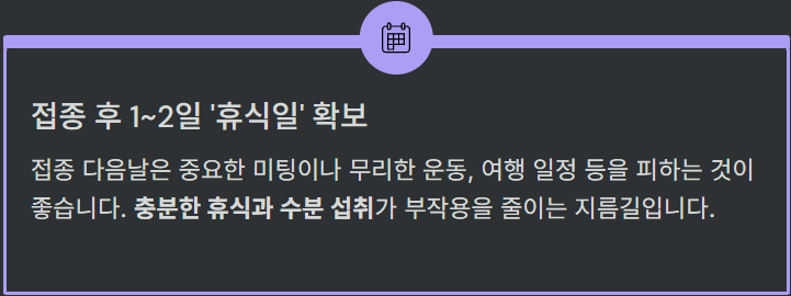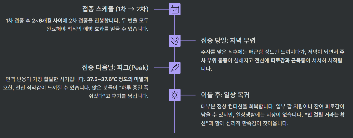 - 피로, 발열, 근육통이 있을 수 있으므로 중요한 일정이나 과로는 피하고 휴식을 권장합니다.