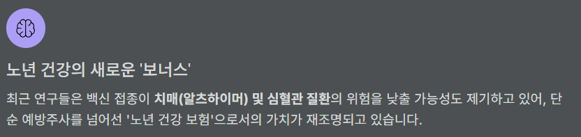또한, 최근 연구에서는 백신 접종이 심혈관 질환, 뇌질환(치매 포함)의 위험까지 낮출 수 있다는 가능성이 제기되고 있어, 단순 예방을 넘어 ‘노년 건강 보험’으로서 의미가 더 커지고 있다는 분석도 나옵니다.