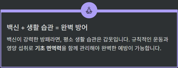 - 백신만으로 완벽 면역이 보장되는 건 아니에요. 생활습관, 면역력 관리도 함께 해야 합니다.
