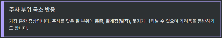 | 첫날 증상 | 주사 부위 통증 + 이른 저녁 무렵 근육통, 피로 시작 |