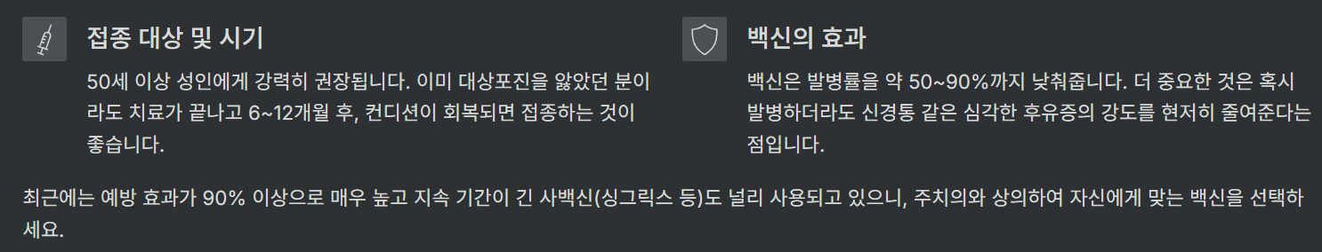 - 특히 50세 이상 성인이라면, 예방 백신 접종으로 발병률과 증상 강도를 낮출 수 있습니다.