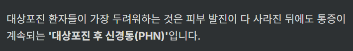 - 대상포진은 수포 부위가 진물로 번지거나, 2차 감염이 생기면 흉터가 생길 수 있습니다.