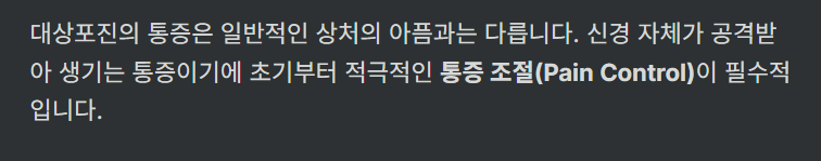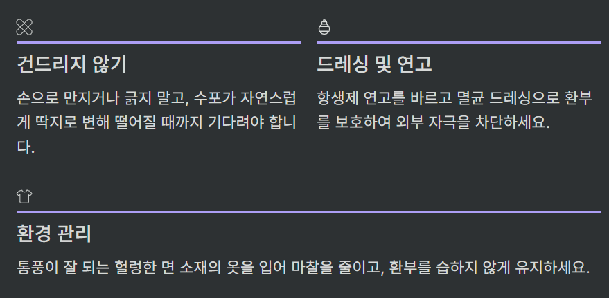 - 수포는 함부로 건드리면 안 되며, 항생제 연고를 바르거나 깨끗한 드레싱으로 관리해야 합니다.