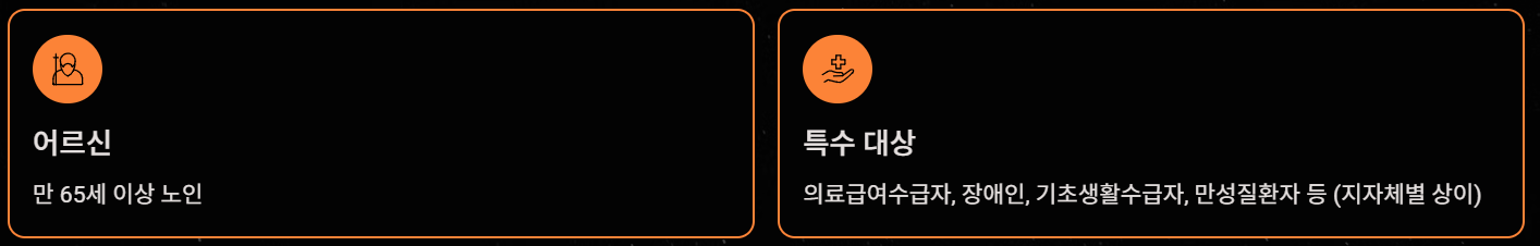 - 일부 지자체 지정의료급여수급자, 장애인, 기초생활수급자, 만성질환자 등(지자체별 상이)