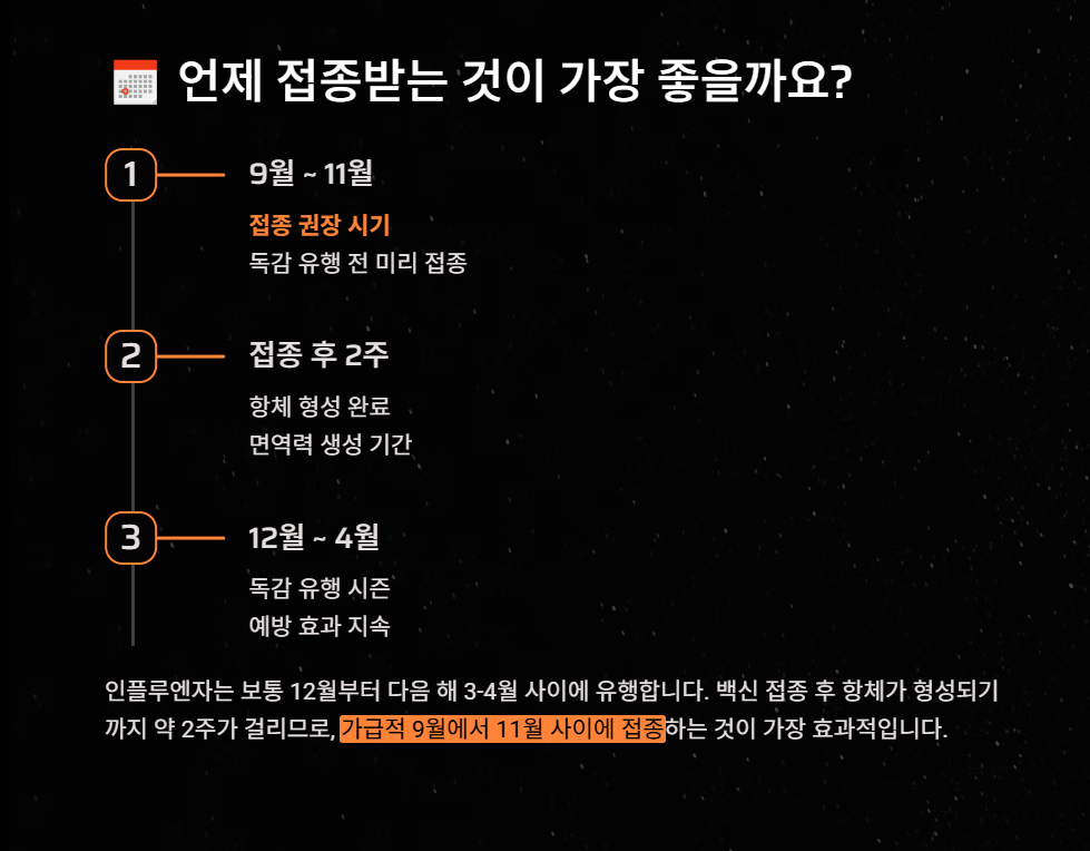 - 백신 접종 후 항체 형성까지 약 2주 걸리므로 → 가급적 9~11월 사이 접종 추천
