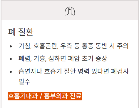- 흡연자나 호흡기 질환 병력 있다면 폐검사 필수