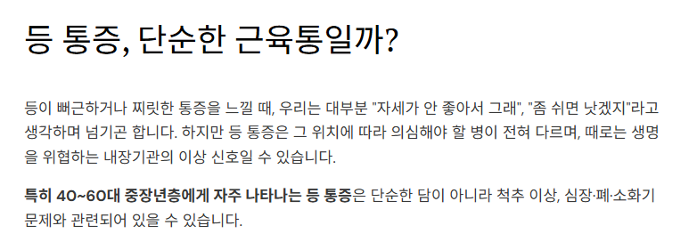 💡 특히 40~60대 중장년층에게 자주 나타나는 등 통증은, 단순한 담이 아니라 척추 이상, 심장·폐·소화기 문제와 관련되어 있을 수 있습니다.
