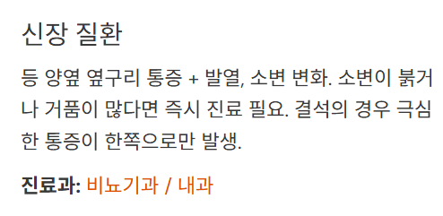 - 등 양옆 옆구리 통증 + 발열, 소변 변화