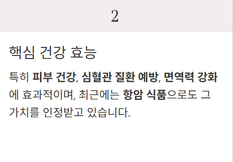 특히 피부 건강, 심혈관 질환 예방, 면역력 강화에 효과적이며, 최근엔 항암 식품으로도 주목받고 있습니다.