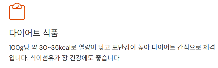 100g당 약 30~35kcal로 열량이 낮고 포만감이 높아 다이어트 간식으로 제격입니다.
