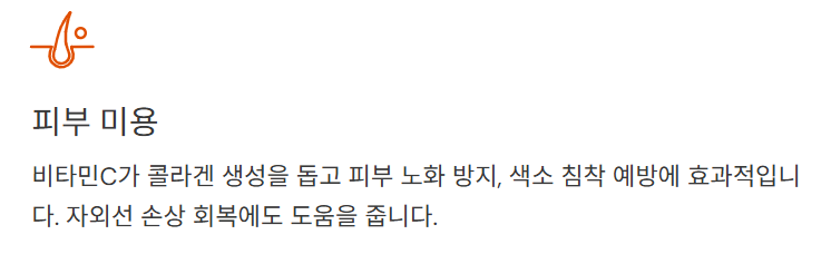비타민C는 콜라겐 생성을 돕고 피부 노화 방지, 색소 침착 예방에 효과적입니다.