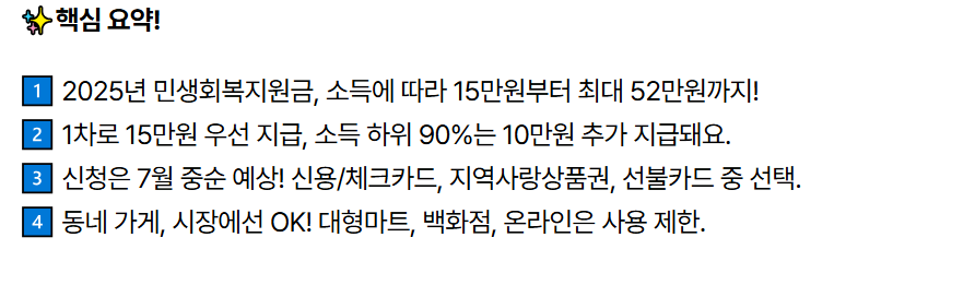 ‘민생지원금’은 물가 상승과 소비 위축으로 어려움을 겪는 국민들에게 지급되는 정부 긴급 생활지원금입니다. 특히 소상공인, 저소득층, 취약계층, 청년·고령자 등에 집중 지원됩니다.