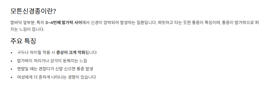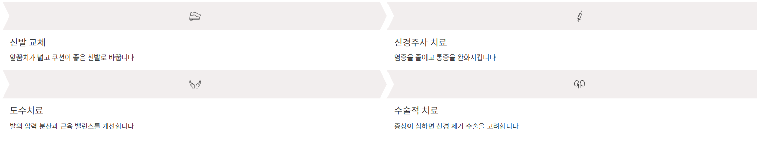 - 구두 착용 시 증상 악화, 통증이 발가락으로 퍼지는 느낌