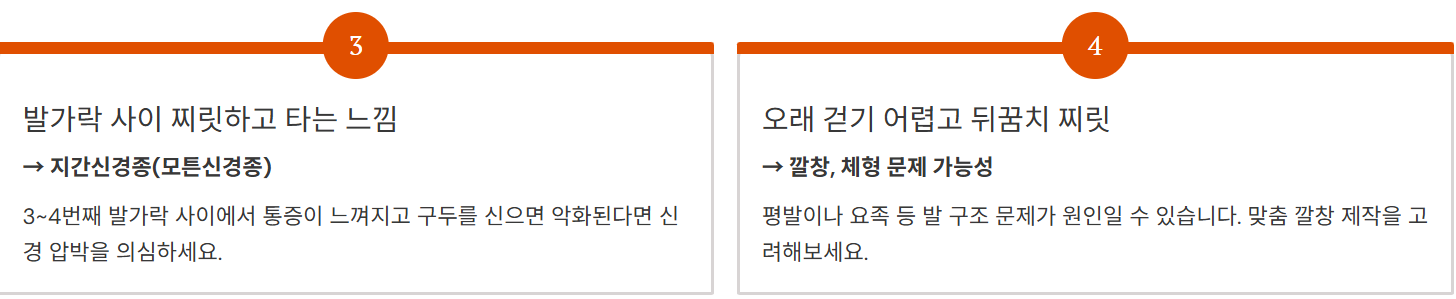 - 오래 걷기 어렵고 뒤꿈치 찌릿 → 깔창, 체형 문제 가능성