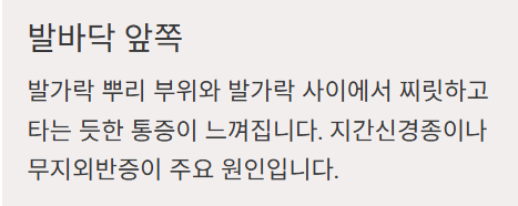 - 발가락 사이 찌릿하고 타는 느낌 → 지간신경종