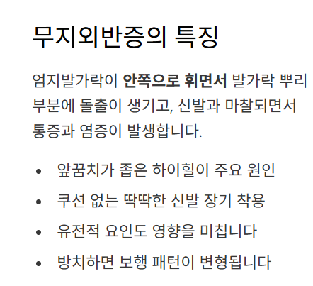 - 발가락 관절이 안으로 휘면서 지지면 통증 유발