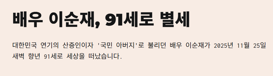 대한민국 연기계의 산증인이자 ‘국민 아버지’로 불렸던 배우 이순재가 2025년 11월 25일(화) 새벽, 향년 91세의 나이로 세상을 떠났습니다.