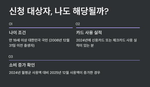 - 신청 대상: 만 19세 이상 국민 (2006.12.31 이전 출생자) + 2024년 카드 사용 실적 있는 분들