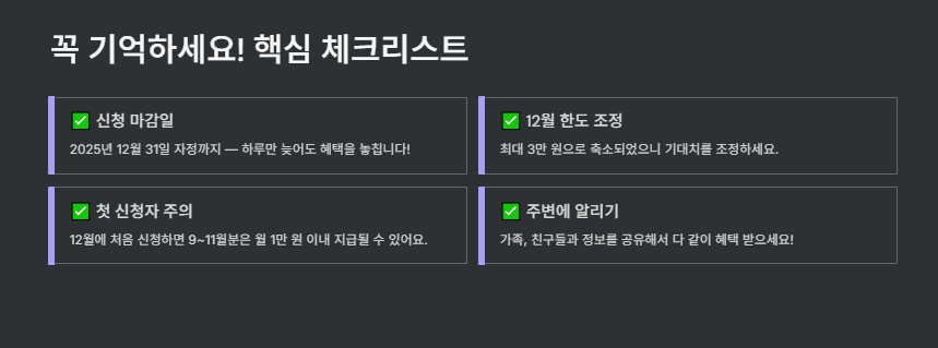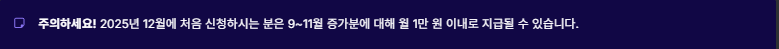 - 2025년 12월에 처음 신청하시는 분은 9~11월 증가분에 대해서는 월 1만 원 이내로 지급 여부가 결정될 수 있어요.