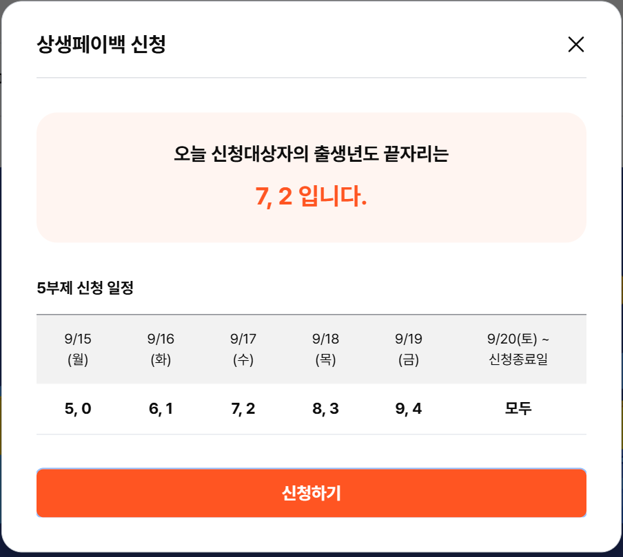 | 첫 주 5부제 운영 | 신청 첫 주에는 출생연도 끝자리 기준으로 신청 요일 제한 있음 | 그 후에는 제한 해제됨. 사용자 몰림 방지 목적 |