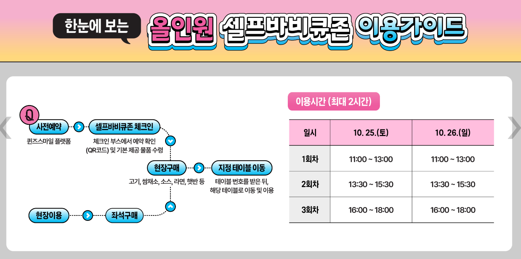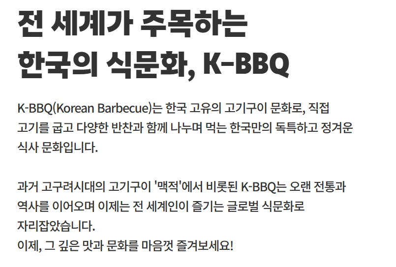 | 예약 항목 | BBQ 시식권, 체험 프로그램(그릴 체험 등), 좌석 예약존 |