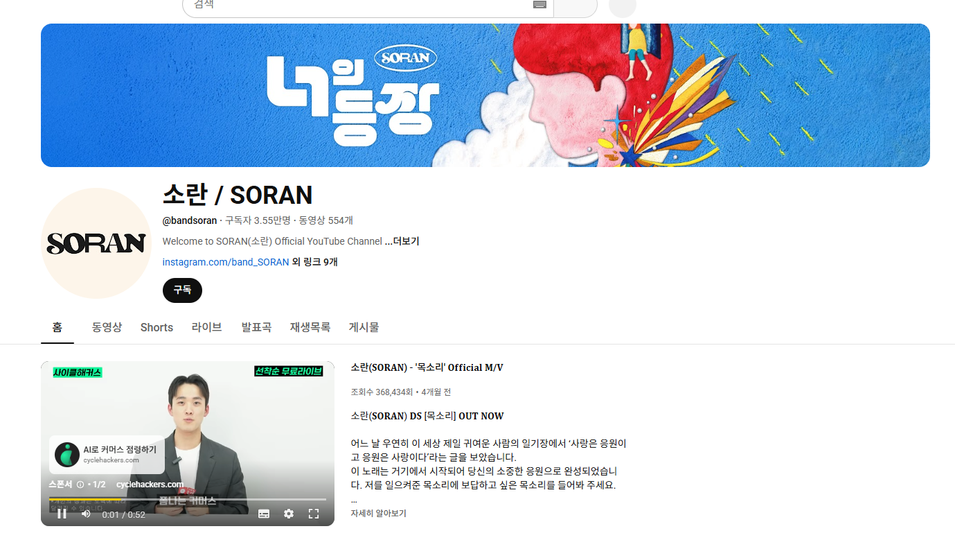 - 유튜브: 신곡 ‘너의 등장’ 어쿠스틱 라이브 영상 공개
