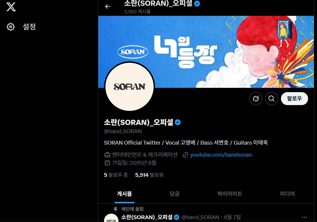 2025년 4월 17일 오후 6시, 밴드 소란(SORAN)이 신곡 ‘너의 등장’을 공개했습니다.