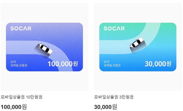 쏘카 모바일 상품권은 여러 종류가 있어요. 기본적으로 20,000원, 30,000원, 50,000원, 100,000원 등 다양한 금액으로 제공되며, 각 상품권은 디자인이 다르게 되어 있어요. 예를 들어, 100,000원 상품권은 푸른색 그라데이션 배경에 차량 일러스트가 그려져 있어요.