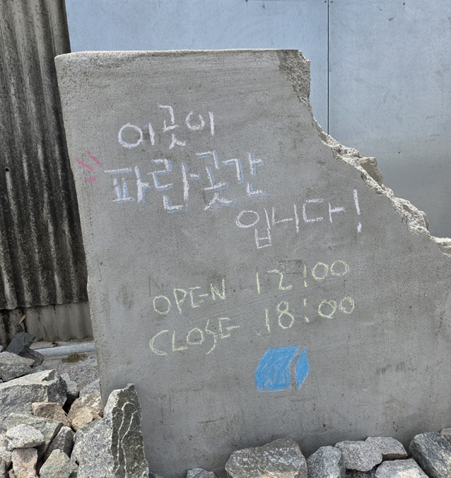 부안 시내에서 차로 10분 남짓, 한적한 교외에 자리한 ‘파란곳간’은 오래된 공장을 리모델링해 만든 공간이었어요. 주창장 시설도 잘 되어있었지만 사람이 많은 탓인지 자리싸움이 조금은 있었습니다. ㅋㅋ 입구에 놓인 대기판? 대기 스크린에 바로 입장 가능하단 문구를 보고 기분 좋게 입장했어요.