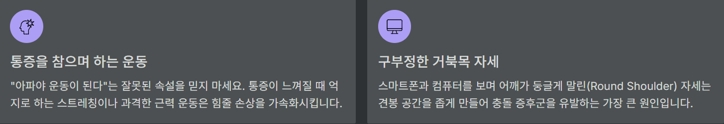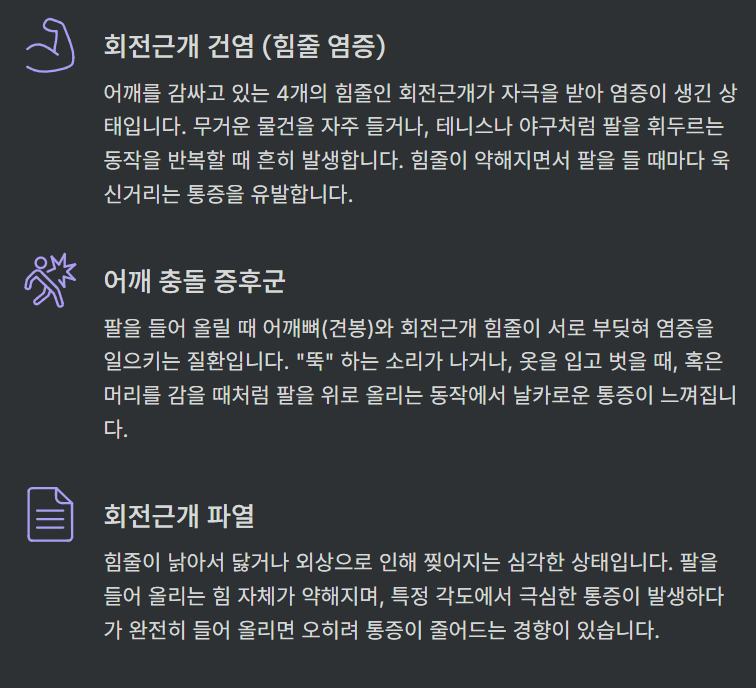 | 어깨를 들어 올릴 때 찌릿 / 팔 전체 사용 시 통증 | 회전근개 건염 / 충돌 증후군 / 점액낭염 |