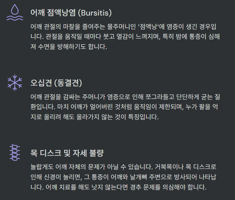 어깨를 들어 올릴 때, 뼈 구조와 힘줄이 반복적으로 충돌하면서 염증이나 통증이 생기는 경우입니다. 특히 팔을 위로 들거나 어깨를 많이 사용하는 사람에게 흔해요. cdtop.co.kr+1 - 동결견 (Frozen Shoulder / Adhesive Capsulitis)