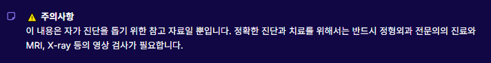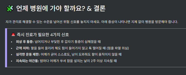 - 만성 통증, 반복된 통증, 일상 생활의 불편함이 지속될 때 → 영상 진단, 물리치료, 전문의 상담 권장
