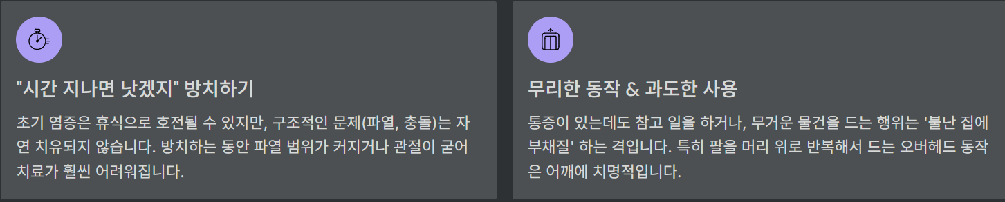 - 통증 있는 쪽 어깨를 계속 사용하거나 무리한 동작 반복