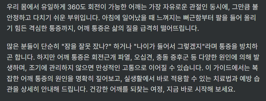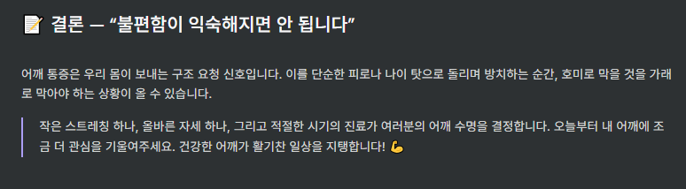 작은 스트레칭 하나, 올바른 자세 하나, 꾸준한 관리 하나가 여러분의 어깨를 건강하게 지켜줄 수 있습니다. 💪